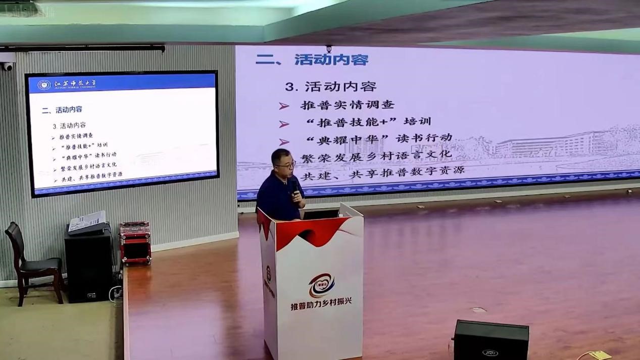 7月5日,由教育部语言文字应用管理司、共青团中央青年发展部共同主办的2024年'推普助力乡村振兴'全国大学生暑期社会实践志愿服务活动出征仪式在江苏师范大学举行。本次出征仪式有来自北京大学、清华大学等高校的1200支团队的12405名大学生志愿者通过线上线下的方式参加出征仪式及实践培训。我校赴青海门源回族自治县、玉树县推普助力乡村振兴服务队的全体师生也通过线上链接参加了本次出征仪式及培训。