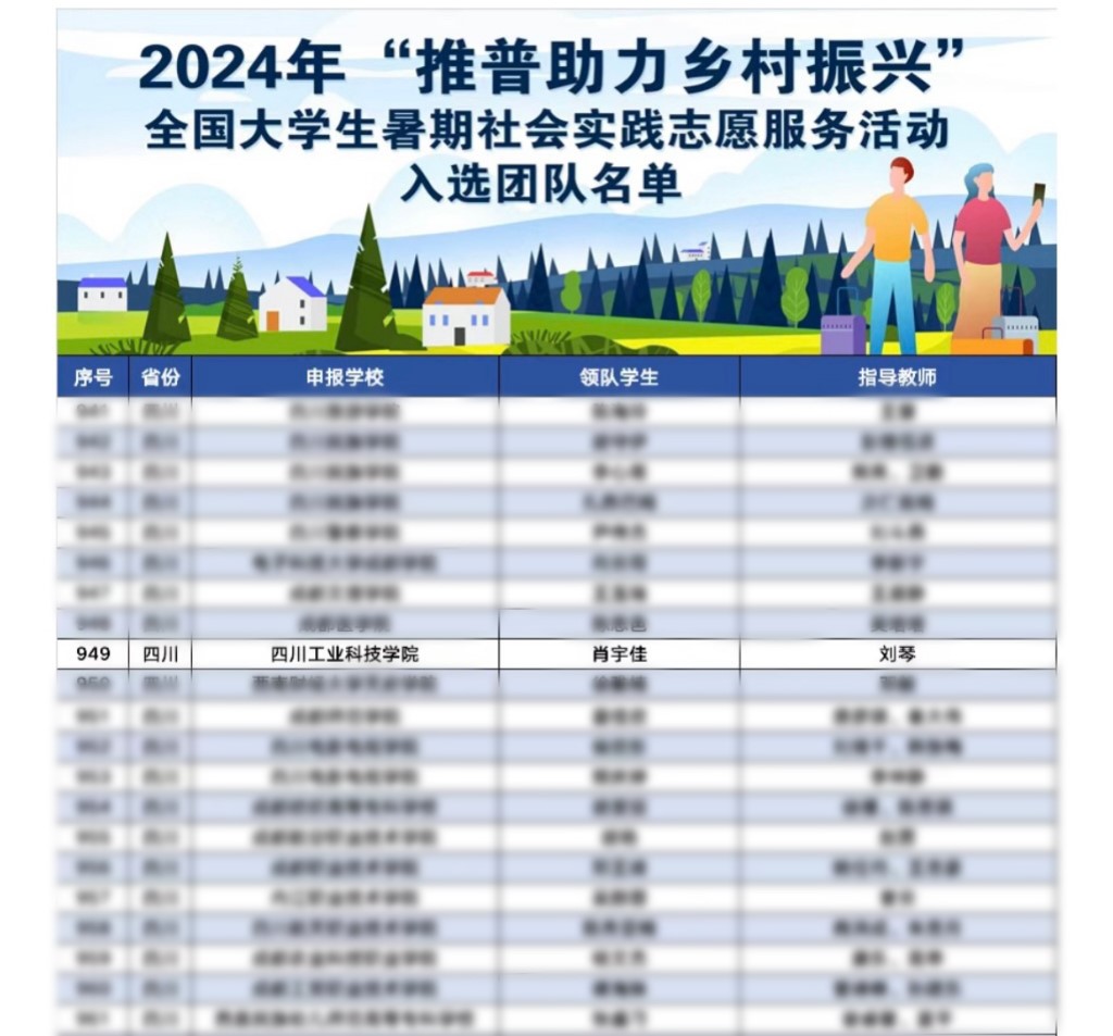 据悉,根据《关于开展2024年“推普助力乡村振兴”全国大学生暑期社会实践志愿服务活动的通知》相关要求,全国有1452所学校积极响应,共有6998支志愿服务团队约7万名学生报名参加,最终遴选出北京大学、清华大学等学校在内的1200支志愿服务团队,其中学校“四川工业科技学院赴青海门源回族自治县、玉树县推普助力乡村振兴服务队团队”成功入选。