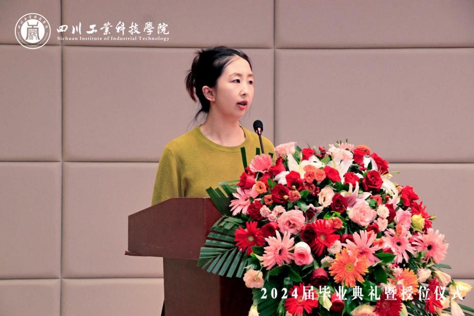 会议第六项,2024届毕业班辅导员代表廖佳英老师发言。她为毕业生们送上祝福,并表达了对于学生未来的期待:“未来是否繁花似锦,源自你们当下之努力。去做一个乐观的人,保持开朗的心态,永远年轻,永远热泪盈眶;去做一个勇敢的人,勇敢面对人生每一个阶段的不确定性和巨大机遇;去做一个坚定的人,翻山越岭,事事竟成。衷心祝愿同学们一切顺利,一路芳华,一生幸福!”