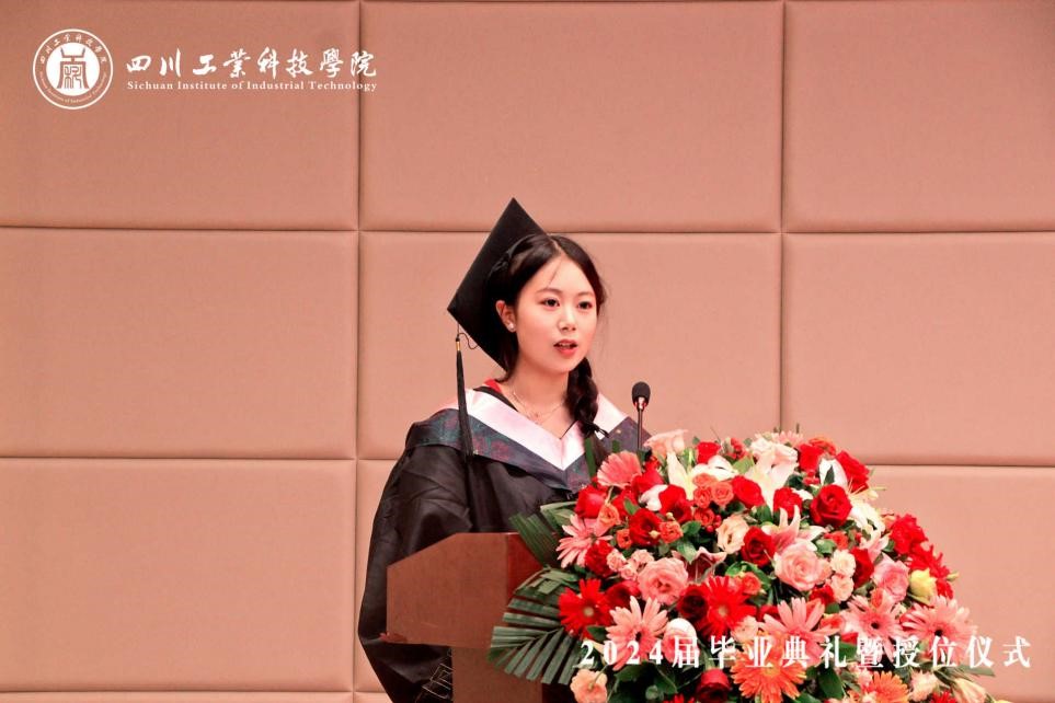 会议第七项,优秀毕业生代表谭境贤发言。她谈到:“毕业也意味着我们学生时代的终结,但并不意味着学习生涯的结束,未来我们要在生活中学习,在学习中生活。让时间作证,我们2024届全体毕业生,一定会牢记“明德、博学、笃行、创新”的校训,做尚德之人、有德之人、施德之人,做学识渊博之人,做不懈追求和捍卫客观真理之人,做敢于担当、敢为人先、勇于创新之人。”