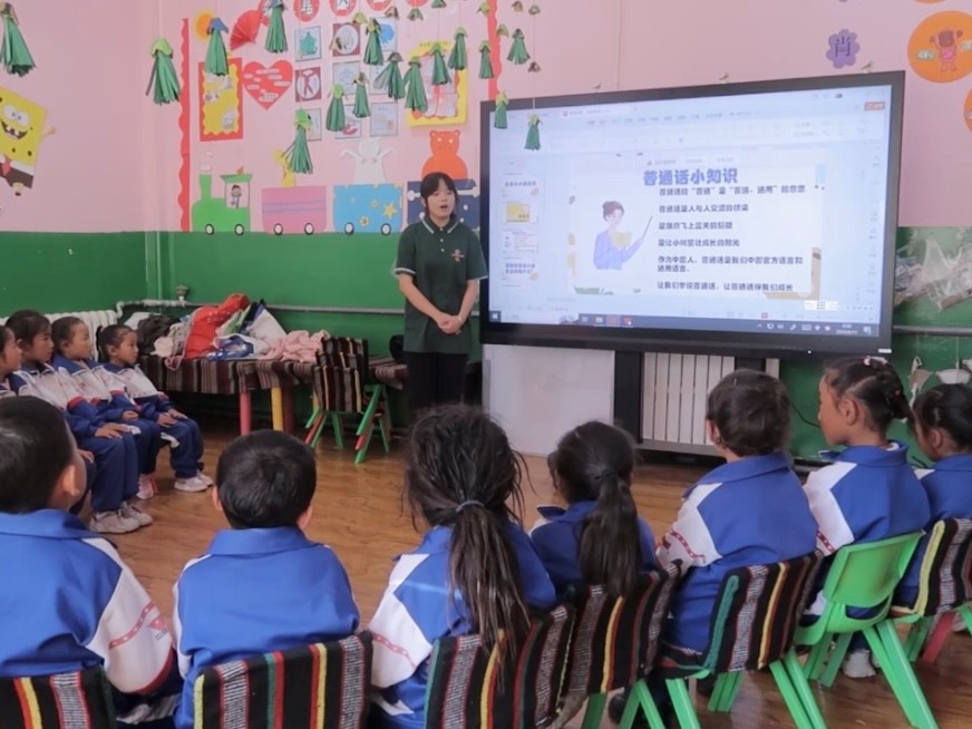 次日,一场别开生面的普通话拓展小课堂在代格村幼儿园拉开了帷幕。志愿者们精心准备了教学内容,以“书同文,语同音,人同心”为主题,用生动有趣的方式引导孩子们学习普通话。从基础的拼音发音到简单的日常对话,志愿者们耐心指导,循循善诱,让孩子们在轻松愉快的氛围中感受到了普通话的魅力。孩子们的眼神中闪烁着好奇与兴奋的光芒,他们跟着志愿者的节奏,大声朗读、积极互动,整个教室充满了欢声笑语。