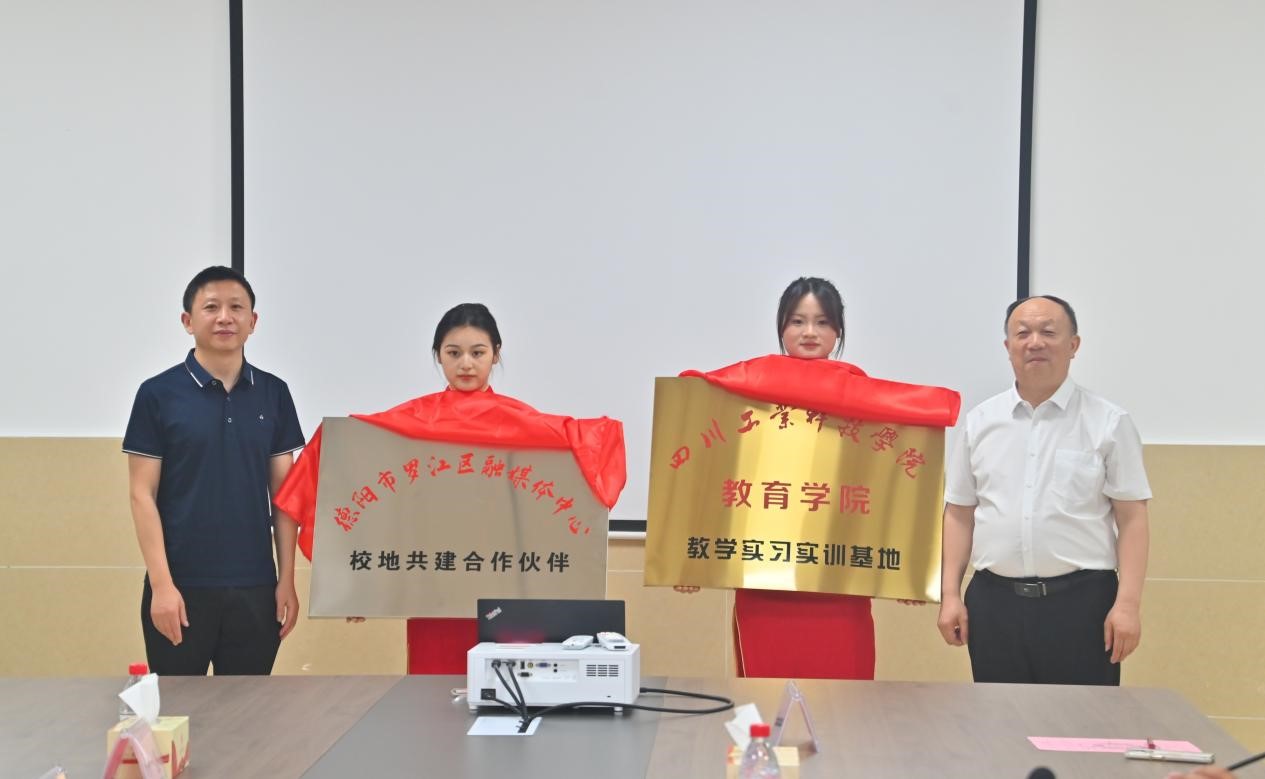 5月15日,教育学院与德阳市罗江区融媒体中心校地合作签约暨揭牌仪式在龑江学村E516举行。