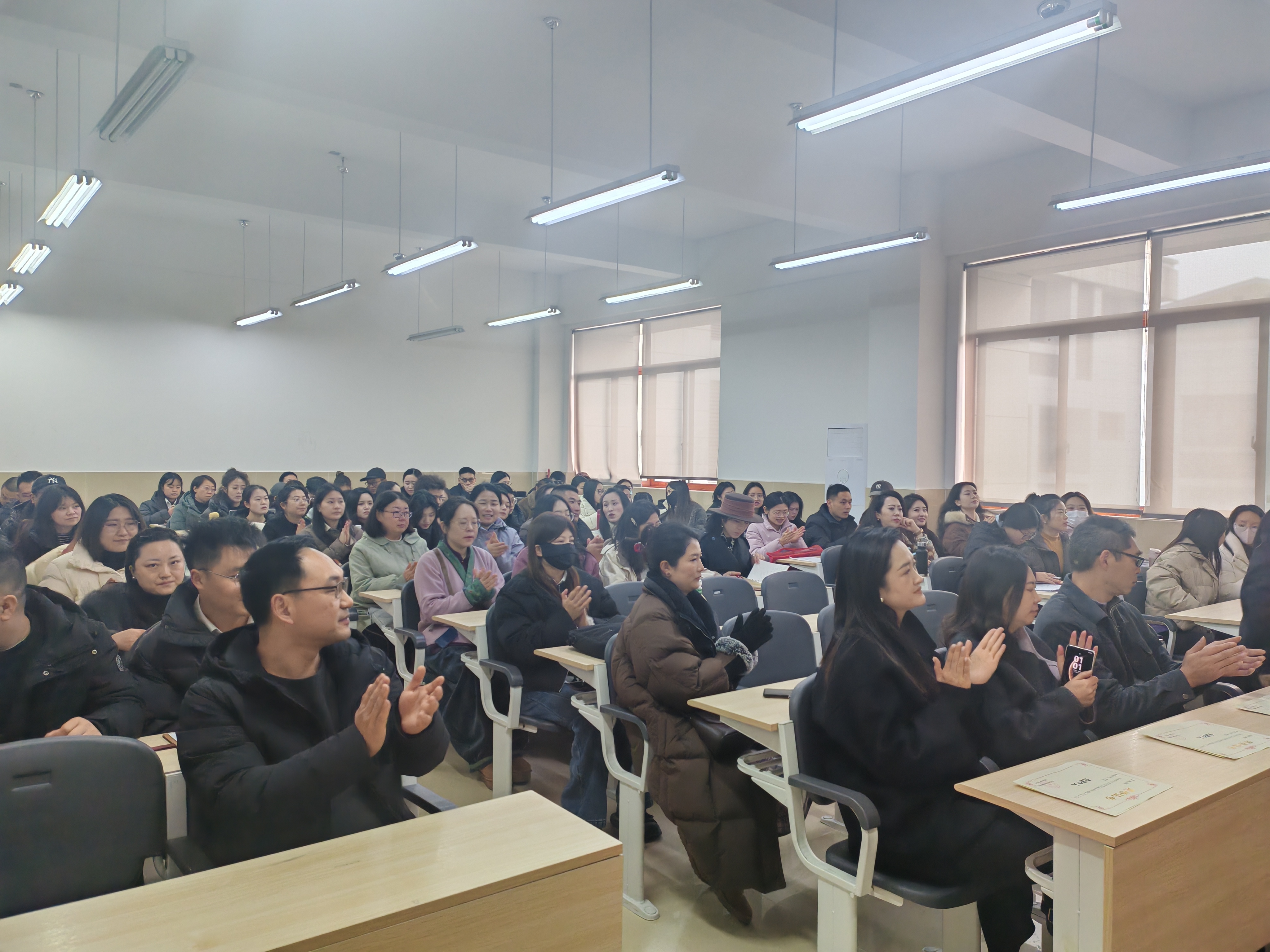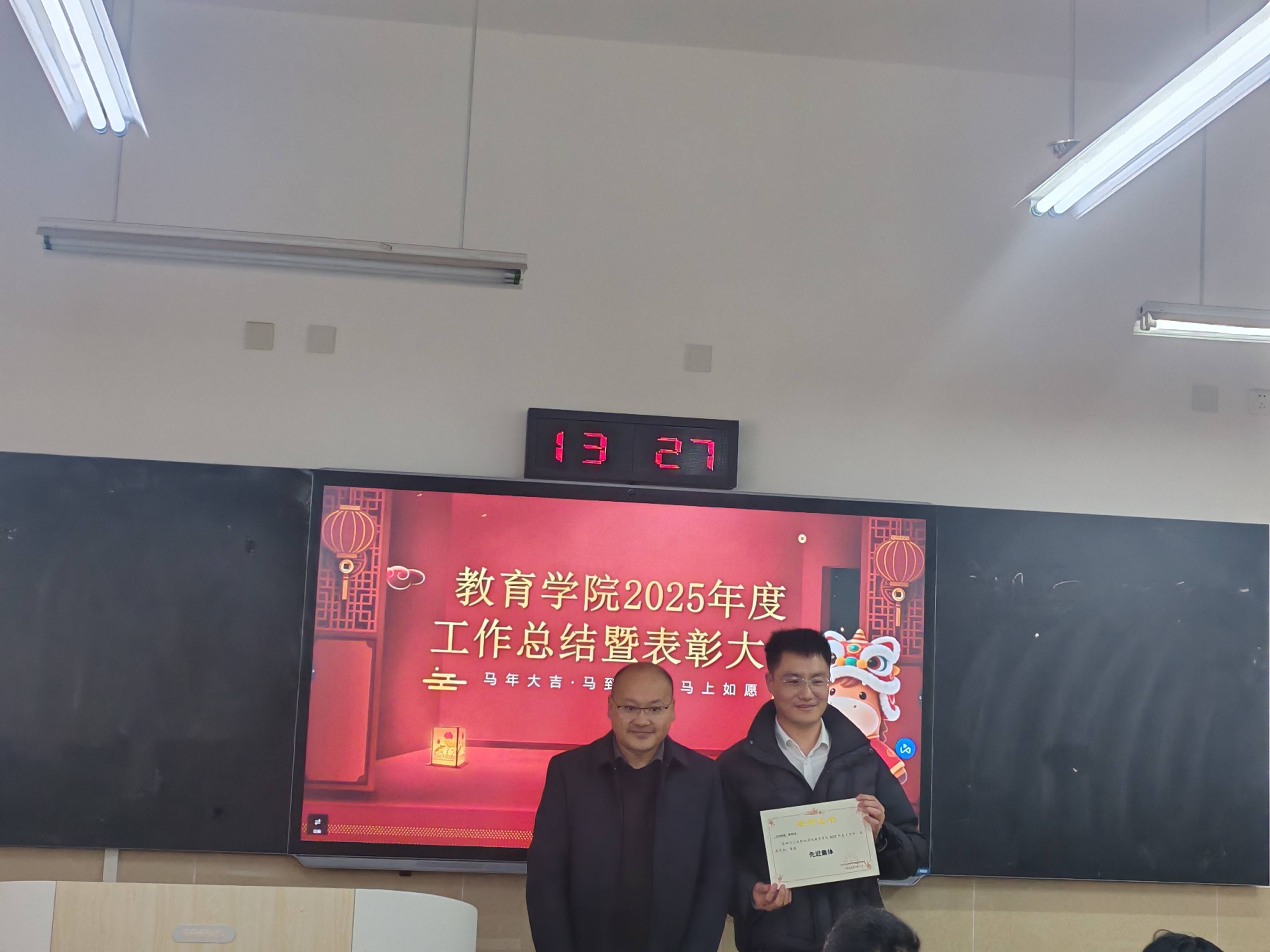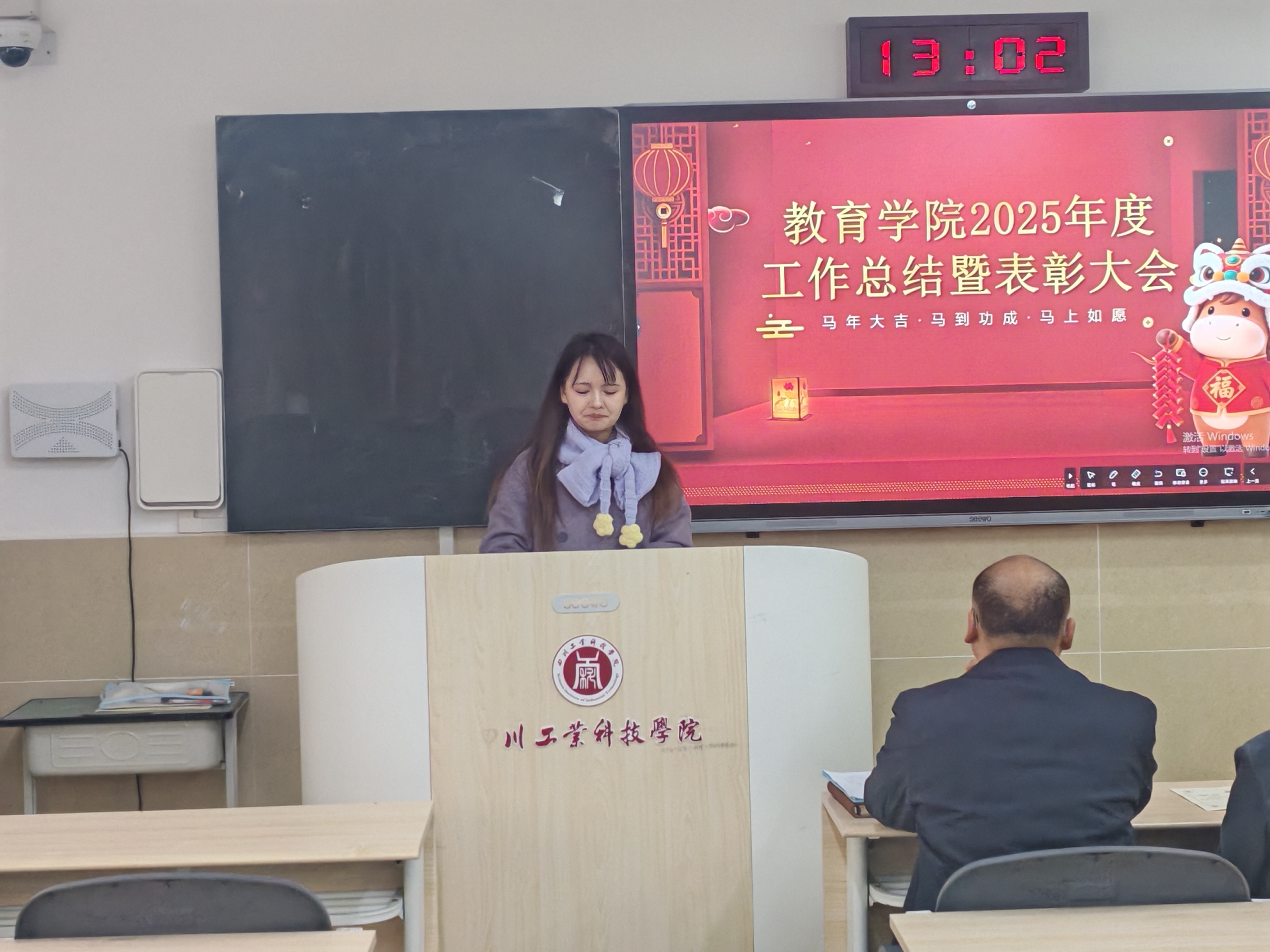 1月18日,教育学院2025年度工作总结暨表彰大会在龑江D410教室召开,会议由学院综合办副主任周洪婷主持,学院全体教师参会。