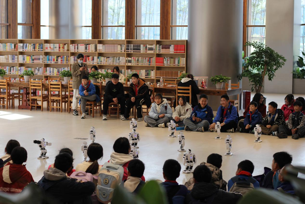 在水街实训中心,同学们近距离观摩了大学实践教学场景,在专业教师的引导下,沉浸式感受“知行合一”的教学理念。随后,研学队伍前往创新创业中心,参观大学生创业项目成果展示,了解项目从构想到落地的过程,在实地探访中真切体会到知识转化为实践的可能性。在校园内的网红图书馆,一场别开生面的机器人表演将科技与创意融合呈现,精准流畅的机械操作引得同学们阵阵欢呼,也点燃了他们对科技探索的浓厚兴趣。活动间隙,同学们围坐操场,沐浴春日暖阳,分享所见所感,欢声笑语为研学之旅增添了别样温情。