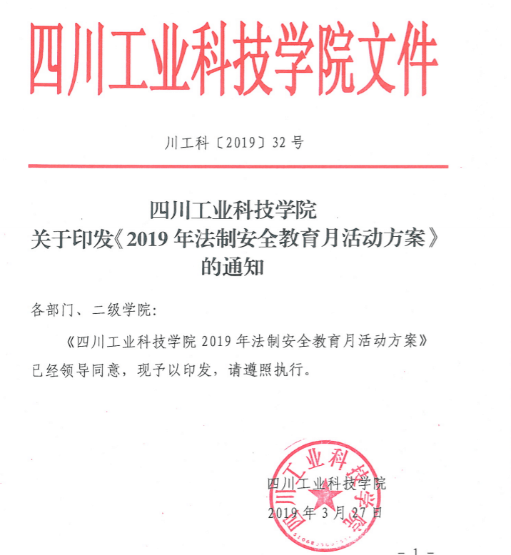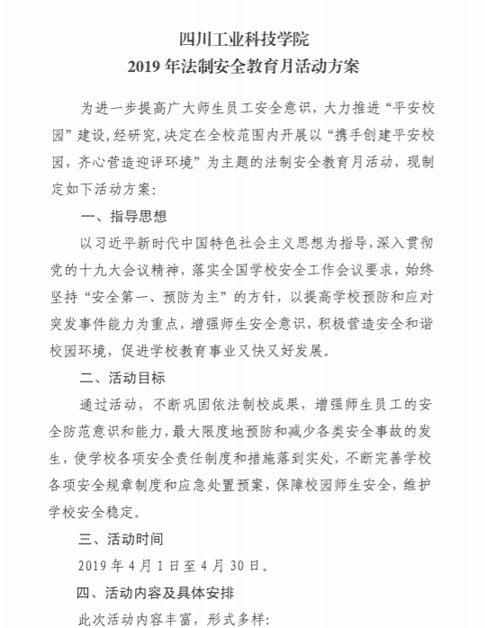 四川工业科技学院关于印发《2019年法制安全教育月活动方案》的通知。