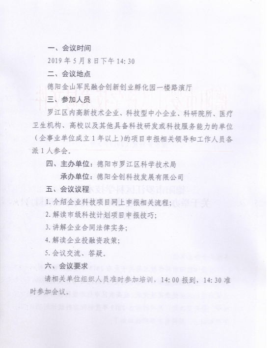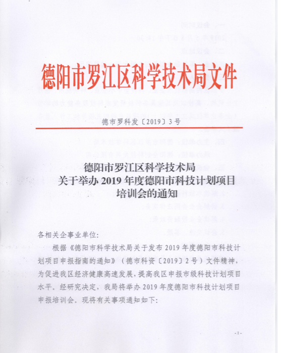 德阳市罗江区科学技术局关于举办2019年度德阳市科技计划项目培训通知。