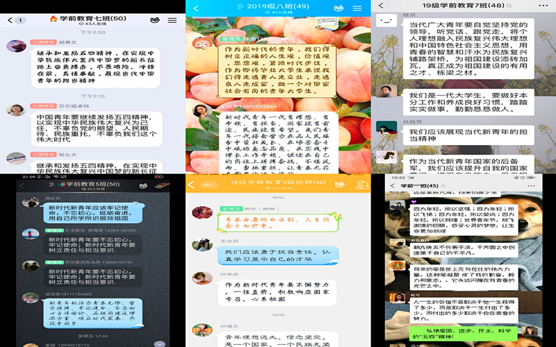 为继承和发扬“五四”精神,大力加强我院学生的思想道德建设,增强团组织的凝聚力和战斗力,响应共青团省委《关于组织青年学生深入学习宣传贯彻总书记五四青年寄语精神的通知》,59日下午,教育学院团总支组织全院青年学子以线上讨论、主题团课、学习感言、作品征集等多种形式进行探讨、学习,以解读、贯彻总书记五四寄语精神。