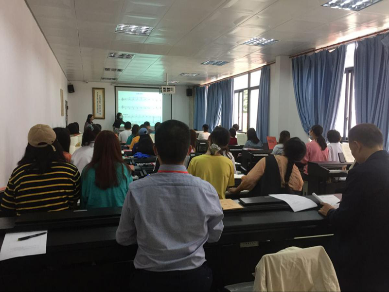 上午10:10,学校党委书记张继华、教育学院院长吴节义、党总支书记熊定永、副院长孙红英一起来到航空实训楼琴房教室203听秦懿老师的《琴法(二)》,由于是新学期的第一堂课,课堂安排主要由复习五线谱的初识循序渐进地引入到新课C大调音阶。在经过讲解之后,学生进行C大调音阶的正向和反向练习,随后进行了简谱的儿歌弹奏教学。听完秦懿老师的课,大家又来到航空实训楼201教室继续听朱莎老师的《幼儿歌曲弹唱(一)》,本堂课朱老师的教授内容是弹唱少儿歌曲《小星星》,通过讲解弹唱时应注意的姿势,状态,气息的运用,吐字的要点等,让同学们掌握了怎样更好地去表演一首幼儿歌曲。