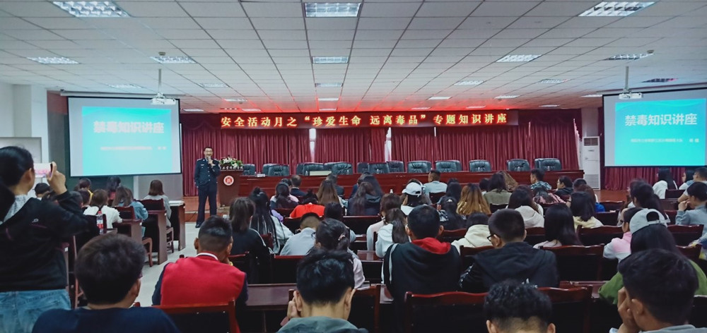杨健讲解了毒品的性质、种类、特征等知识,同时结合收集到的吸毒案例,深入浅出地给学生论述和分析了毒品的危害,以血的教训、铁的事实告诫师生们认清危害,树立自我保护意识。告诫同学们要正确面对困难和挫折,谨慎交友,拒绝与社会上有不良习气的人来往,要远离营业性网吧、歌厅、迪厅及KTV等不健康场所,树立健康向上的人生观。