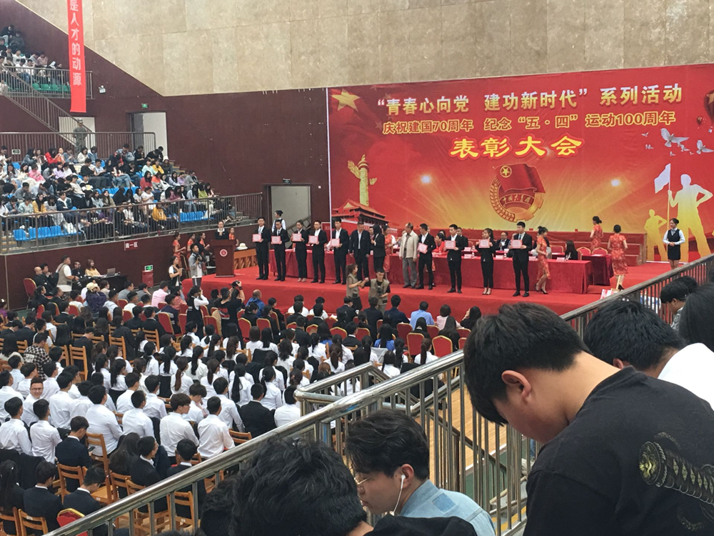 5月8日,18级学前2班全体学生在体育馆参加2019年庆祝建国70周年,纪念五四运动100周年表彰大会。