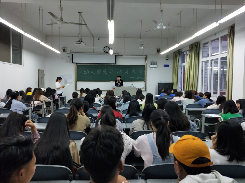 5月4日,18级学前9班举行幼儿园见习动员大会。此次动员大会由见习带队老师王迪一主持,辅导员陈鹏羽及9班全体同学参加。