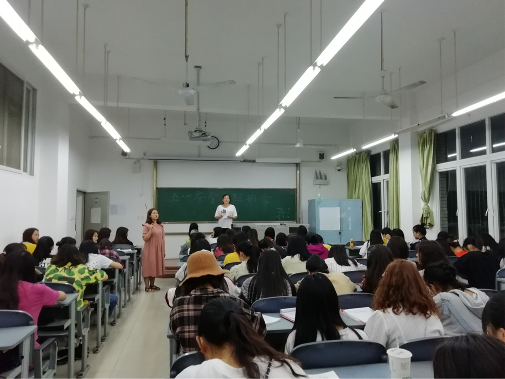 4月28日晚,18级学前教育1班在6-102教室召开'五一安全'主题班会,辅导员张杰及18级学前1班全体同学参会。