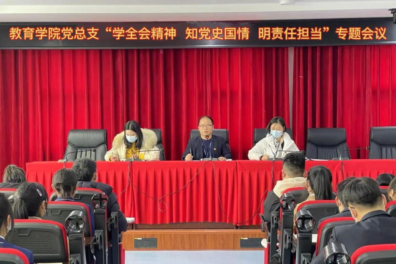 为深入学习十九届六中全会精神,明中华民族伟大复兴之责任。11月29日中午,教育学院于东校区图书馆301会议室举行“学全会精神,知党史国情,明责任担当”专题教育学习会议。教育学院党总支书记熊定永,学工办主任、党总支学生支部书记黄译漫,团总支书记廖佳英,全体辅导员和部分党员、教师代表以及第32期党校全体学员、近期预备党员发展对象参加了专题学习活动。