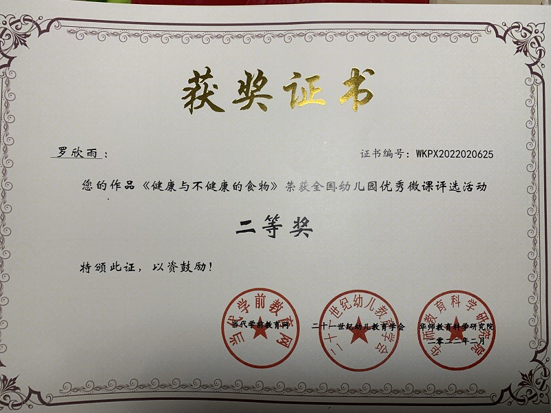 一分耕耘,一分收获;砥砺前行,收获满满。在2021年寒假期间举办的“全国幼儿园优秀微课评选活动”中,我院19级杨彩巍、赵国美、罗欣雨、20级学前教育专业张慰欣、喻欣、徐雨、佳姆7位同学利用寒假时间,在我院专职教师曾雪老师的指导下,同学们不断打磨教学设计、试讲水平,最终佳姆、罗欣雨荣获二等奖 张慰欣、喻欣荣获三等奖;赵国美、杨彩巍荣获优秀奖。