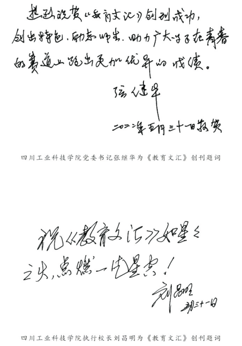《教育文汇》的筹备创刊得到了学校党政领导的关心、支持与厚爱。学校党委书记张继华、执行校长刘昌明分别挥毫作创刊题词,对《教育文汇》寄予厚望,他们分别写到:“热烈祝贺《教育文汇》创刊成功……助力广大学子在青春的赛道上跑出更加优异的成绩!”“祝《教育文汇》如星星之火,点燃一片星空!”,希望该刊充分发挥其应有作用,成为师生增进思想交流、开展专业学术与教育热点问题探讨、文学艺术创作与品鉴的重要平台,增进与丰富校园文化氛围及底蕴。