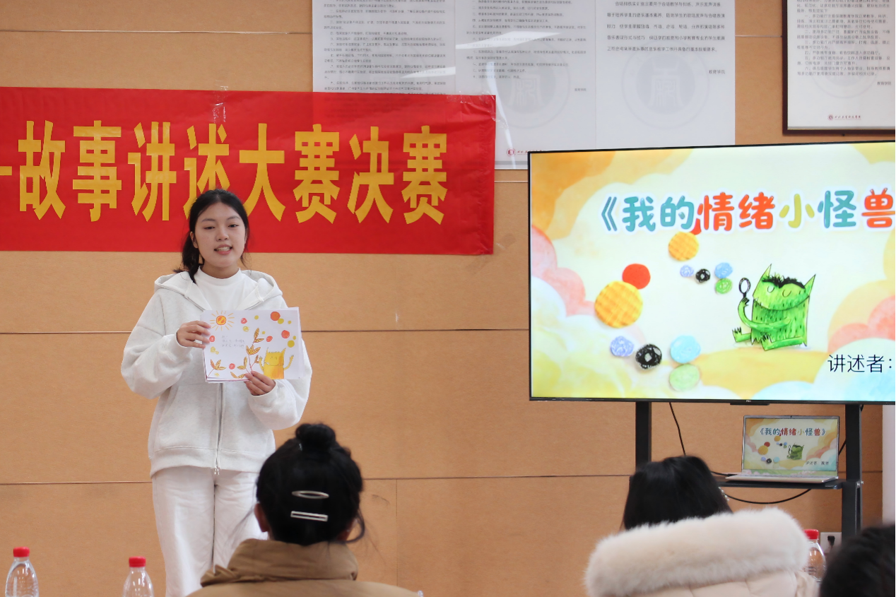 活动现场气氛热烈,参赛选手各展所长。黄滟同学在《我的情绪小怪兽》中,通过富有创意的拟人化表达,将抽象情绪具象为生动的角色,帮助观众直观理解情绪管理,其互动式的演绎赢得了现场观众的积极回应。张仕芳同学在讲述《一枚银币》时,以清晰的叙事节奏和真挚的情感投入,生动诠释了诚信品质的价值,引发了现场师生的深度共鸣。