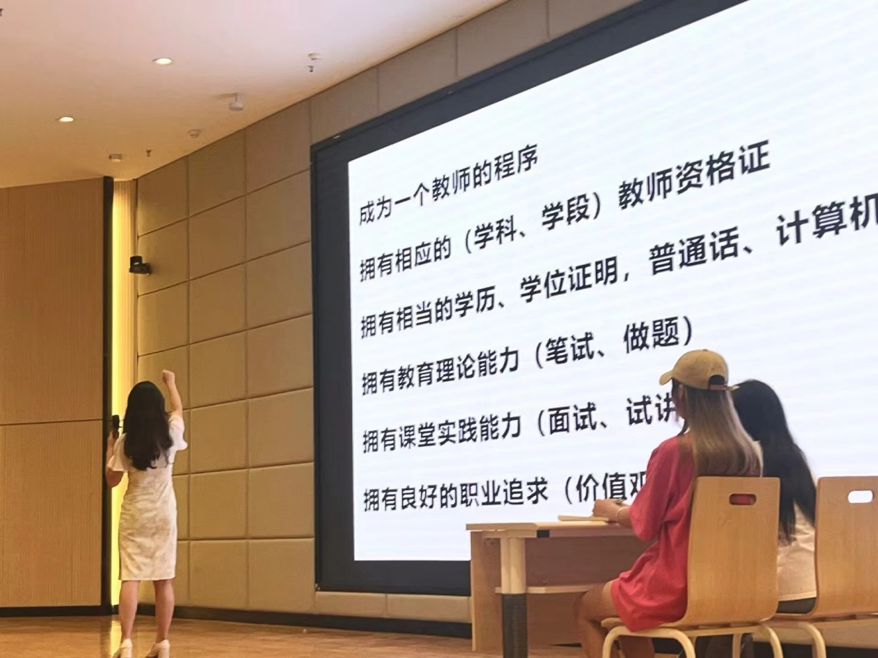 其次,曹校长从唐代诗人韩愈《师说》中“师者,所以传道、授业、解惑者也”入手,针对何以为师这个问题引导学生们揭示教育的规律:循序渐进、因材施教、有教无类。紧接着,曹校长为学生们讲解了成为一名教师的相关程序,并在现场模拟教师资格证的面试环节,邀请听课学生积极参加现场模拟教师资格证的面试。在模拟面试情景中,曹校长就模拟面试者的面试情况进行点评,指出其优点与不足,然后耐心的讲解改进方法,鼓励面试者多次尝试,并强调成为一名教师信心、气质、教师姿态是必不可少的。