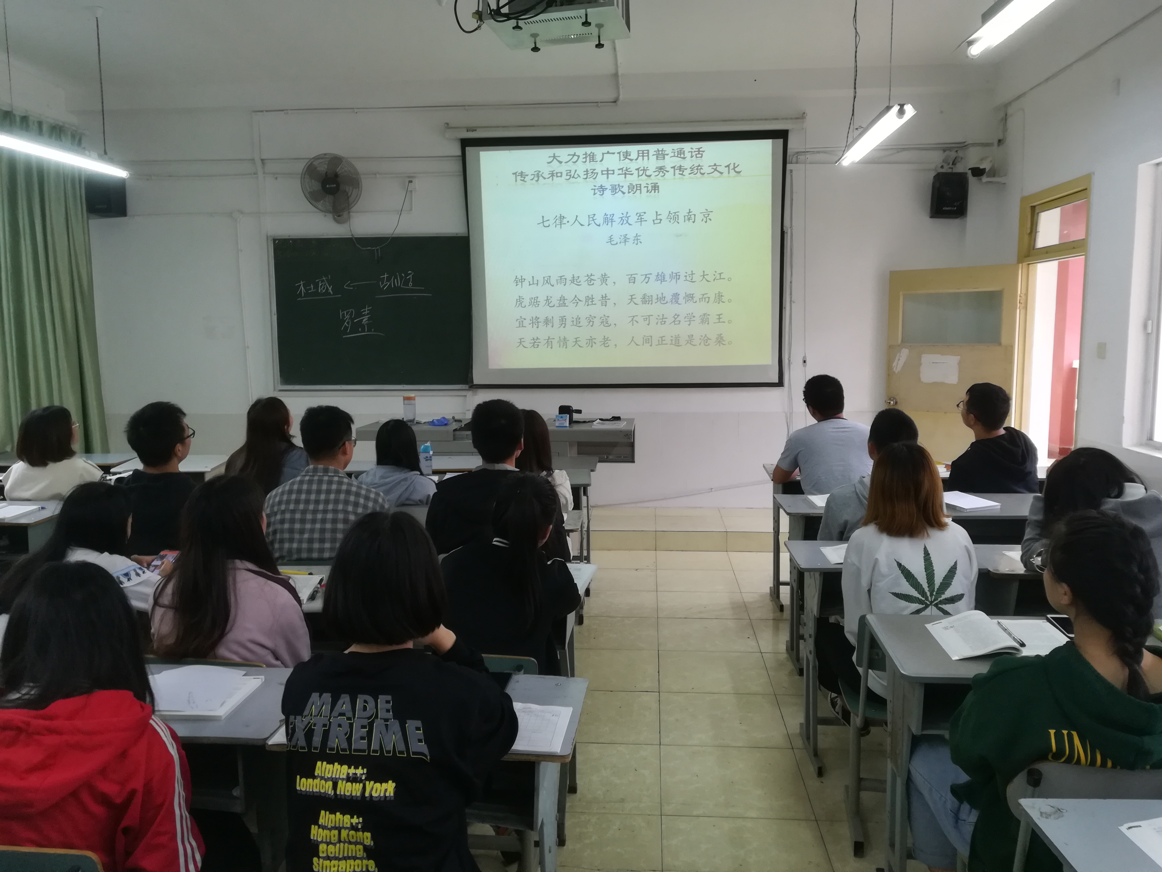 组织学生通过用标准的普通话有感情地朗诵,歌唱传统诗词,培养爱国主义情怀,学生们通过个人朗诵,演唱,集体诵读的形式感受古诗词魅力。
