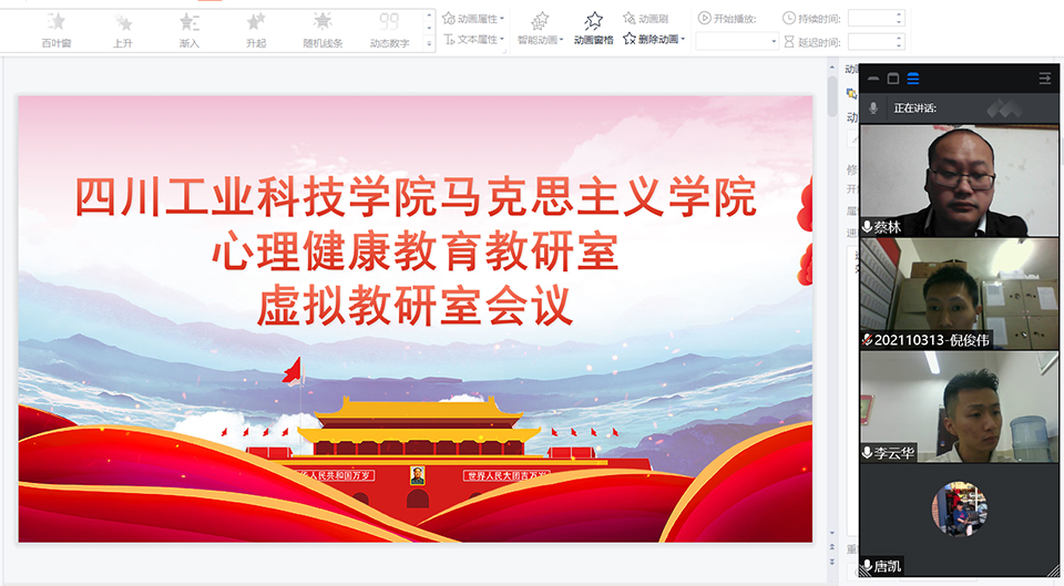 为认真贯彻《教育部关于深化本科教育教学改革全面提高人才培养质量的意见》、《教育部高等教育司关于开展虚拟教研室试点建设工作的通知》等文件精神。2021年10月8日,马克思主义学院心理健康教育教研室罗江、绵竹两地三校区的全体老师相聚云端,召开虚拟教研室会议。会议由马克思主义学院副院长、虚拟教研室主任蔡林主持。
