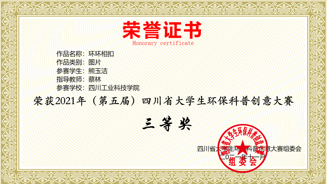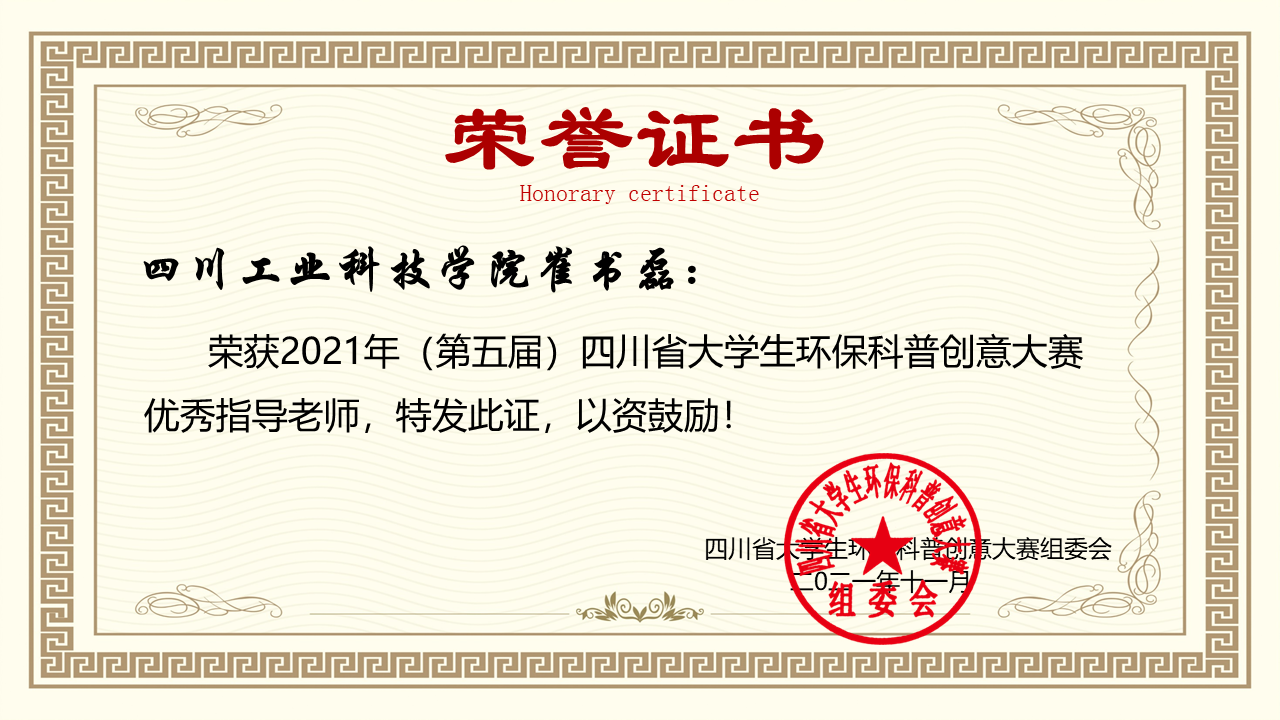 11月6日,由中国环境科学学会、四川省生态环境厅、四川省科学技术协会指导,四川省教育厅主办,西华师范大学、四川省环境科学学会承办的2021(第五届)四川省大学生环保科普创意大赛在西华师范大学落下帷幕。大赛共有48所高校参赛,我校6个作品进入决赛并分别获得1项一等奖、2项二等奖和3项三等奖,崔书磊老师荣获优秀指导老师。