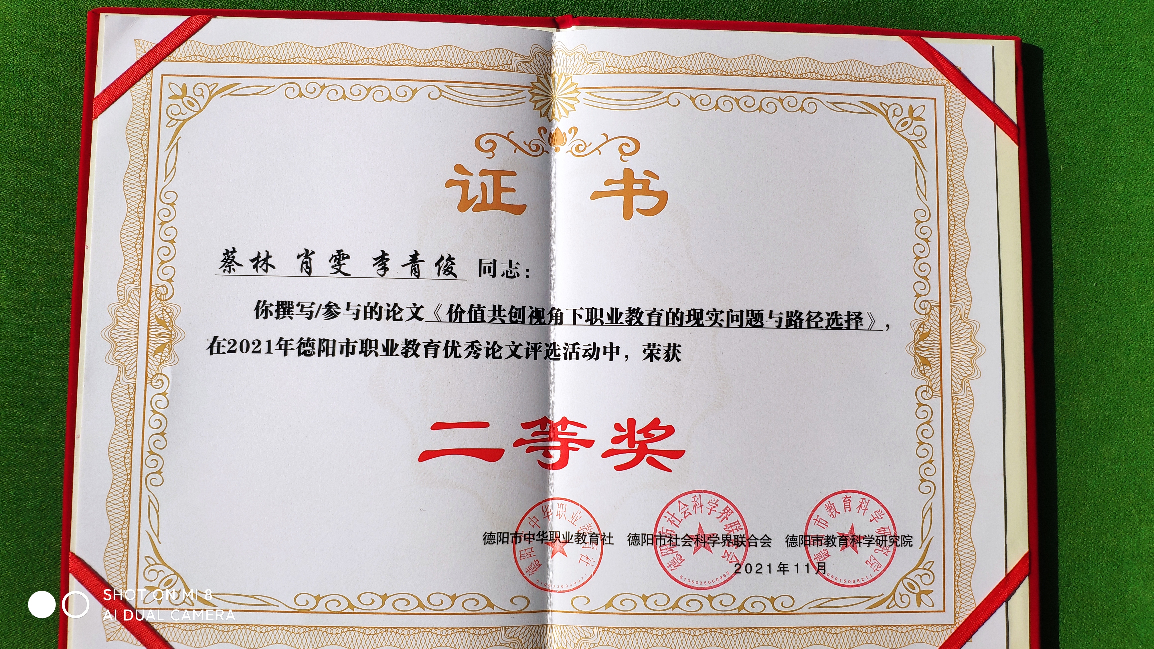 近日由德阳市中华职业教育社、德阳市社会科学界联合会、德阳市教育科学研究院共同举办的2021年德阳市职业教育优秀论文评选活动完美落幕。我校马克思主义学院蔡林副教授和我校本科生肖雯、李青俊同学共同撰写的论文《价值共创视角下职业教育的现实问题与路径选择》荣获二等奖。