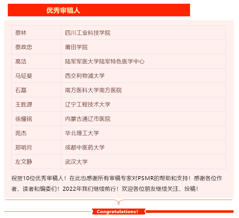 根据2021年审稿专家的审稿质量、审稿速度、审稿数量等数据统计,经《Psychosomatic Medicine Research》期刊主编办公会审定,我校副教授蔡林和武汉大学、陆军军医大学、南方医科大学等10名审稿人被评选为优秀审稿人。