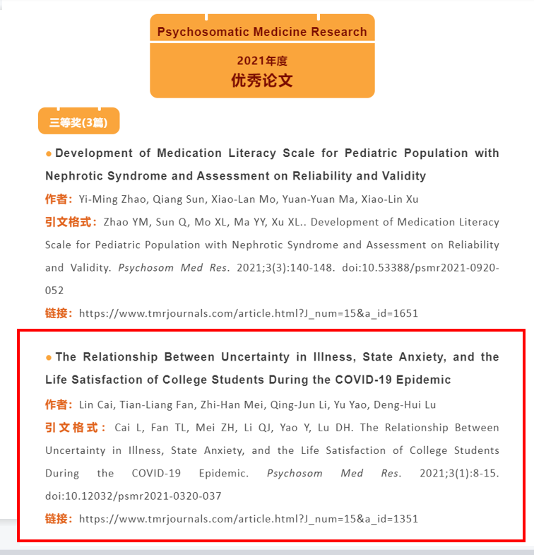 为表彰优秀作者及审稿人,鼓励高质量论文的发表,弘扬扎实严谨的学术风气,进一步提升期刊的办刊质量和学术水平。心身医学研究期刊编辑部启动了2021年度优秀论文及审稿人评选工作。本次评选以《Psychosomatic Medicine Research》杂志2021年度发表的论文为对象,进行初评、复评和终评,共评选出6篇优秀论文。我校蔡林副教授团队发表论文《The Relationship Between Uncertainty in Illness, State Anxiety, and the Life Satisfaction of College Students During the COVID-19 Epidemic》荣获《Psychosomatic Medicine Research》杂志2021年度优秀论文三等奖。