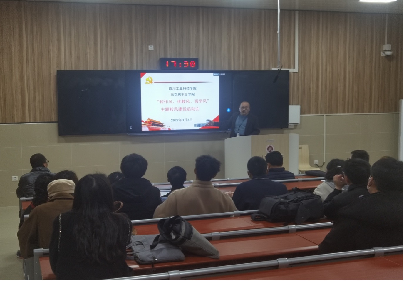 3月3日下午5.30,马克思主义学院在龑江校区B-212开展“转作风、优教风、强学风校风建设启动会”,马院全体专兼职老师参加,会议由蔡林主持。