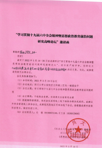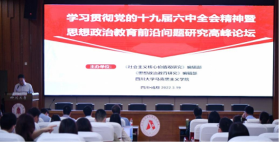 为进一步学习贯彻党的十九届六中全会精神和习近平总书记“3?18”重要讲话精神,喜迎党的“二十大”,2022319日,由《社会主义核心价值观研究》编辑部、《思想政治教育研究》编辑部和四川大学马克思主义学院主办的“学习贯彻党的十九届六中全会精神暨思想政治教育前沿问题研究”高峰论坛在四川大学隆重召开。我校马克思主义学院党总支副书记、副院长蔡林副教授和我校两位本科生卢登会、王世一应邀参加本次高峰论坛。