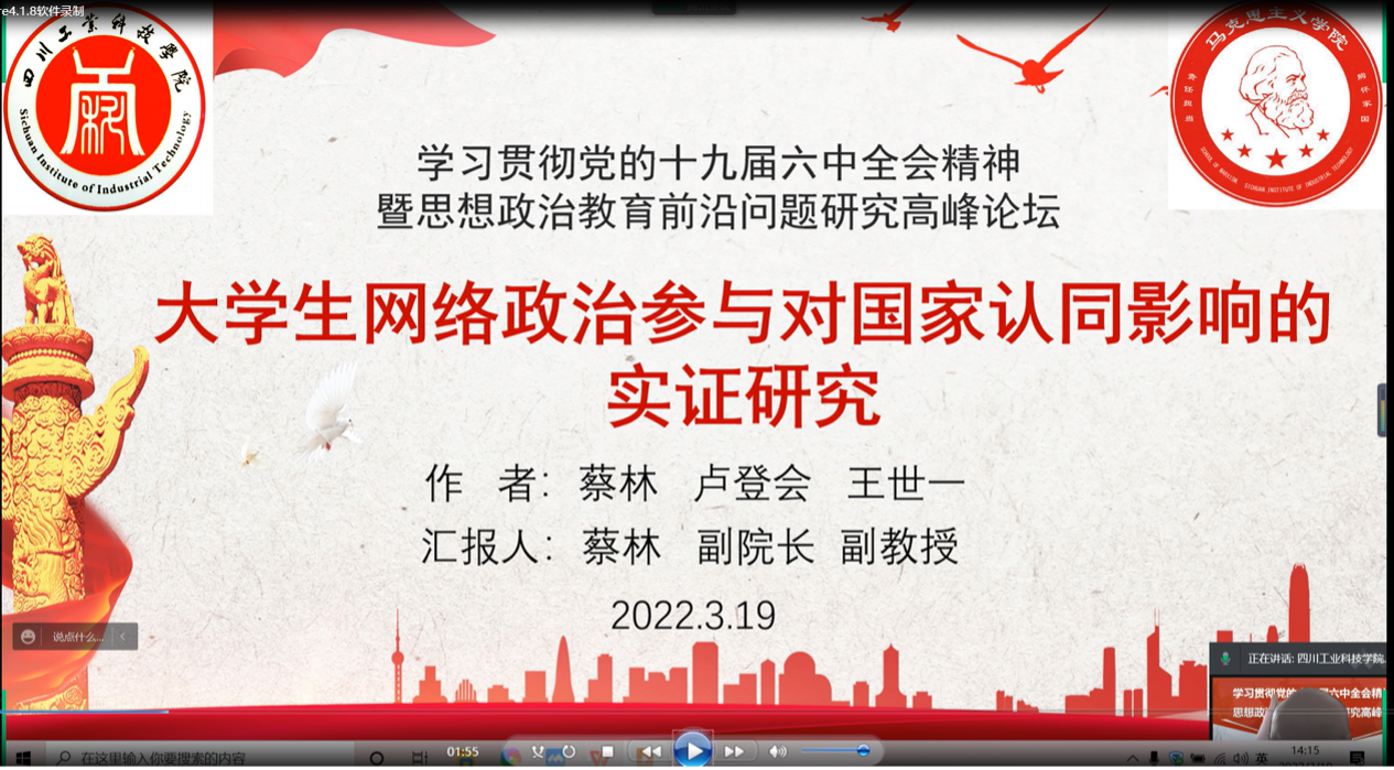 分论坛阶段,来自全国的30多位教师和学生分别围绕思想政治教育基础理论与实践、高校思政课改革创新和学习贯彻党的十九届六中全会精神三个主题进行了热烈的讨论。我校马克思主义学院蔡林副教授和两位本科生卢登会、王世一参加了第一分论坛。蔡林副教授以《大学生网络政治参与对国家认同影响的实证研究》为题进行了分论坛报告。在报告中蔡林从研究背景、研究设计、实证分析、对策建议四个方面进行了详细汇报。四川大学党委宣传部副部长、党委教师工作部副部长(兼)、马克思主义学院纪志耿教授在点评中指出:蔡林老师和两位本科生的文章聚焦于前沿研究,利用回归分析的方法,科学的分析了网络政治参与对大学生国家认同影响,具有很强的现实意义。
