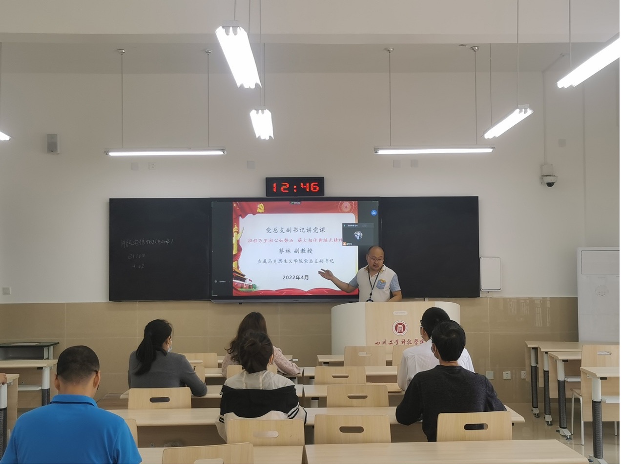 按照会议流程,组织委员冯军成介绍了本次会议召开的背景。学院党总支副书记蔡林副教授给全体参会人员以《征程万里初心如磐石,薪火相传黄继光精神》为题讲了一堂富有深远意义的党课。通过介绍了黄继光的生平事迹,凝练黄继光精神,告诫全体党员同志要坚定理想信念,深入学习黄继光精神,结合自身事迹,不断创新方法,为学院党建工作高质量发展作出积极贡献。宣传委员黄长云带领参会人员学习了《中共中央关于党的百年奋斗重大成就和历史经验的决议》,就学院党员政治理论学习工作常态化进行介绍,强调要注重理论学习,不断坚定理想信念。教师党支部书记江春雷就学院党小组会进行部署,提出要加强组织建设。