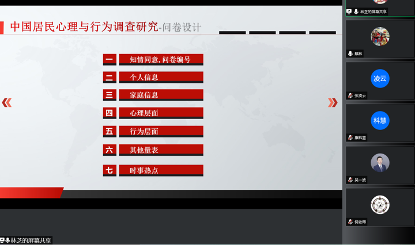 为进一步促进中国居民心理与行为调查研究(China psychology and behavior studyCPBS)问卷内容合理性和科学性,更好的吸取各位专家老师的意见。425日下午,中国居民心理与行为调查研究负责人吴一波研究员邀请德阳市哲学社会科学重点研究基地心理与行为研究中心负责人,我校马克思主义学院蔡林及其研究团队进行线上研讨。会议由吴一波主持。