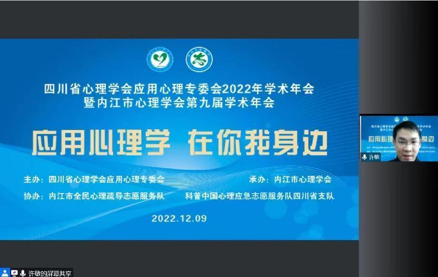2022年12月9日由四川省心理学会应用心理专委会主办,内江市心理学会承办,内江市全民心理疏导志愿服务队协办的“四川省心理学会应用心理专委会2022年学术年会暨内江市心理学会第九届学术年会”在腾讯会议线上举行。本次会议以“应用心理学,在你我身边”为主题,聚焦心理社会服务和心理学应用。