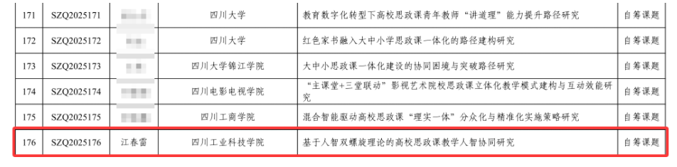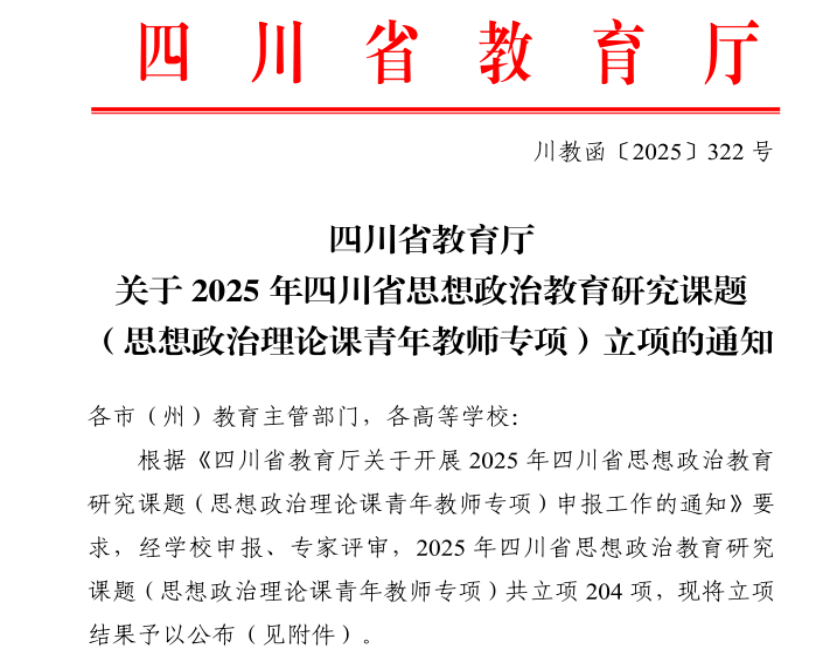 近日,四川省教育厅正式公布了2025年度四川省思想政治教育研究课题立项名单。马克思主义学院江春雷老师申报的课题,获批“思想政治理论课青年教师专项”立项。