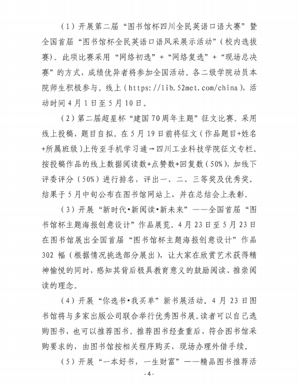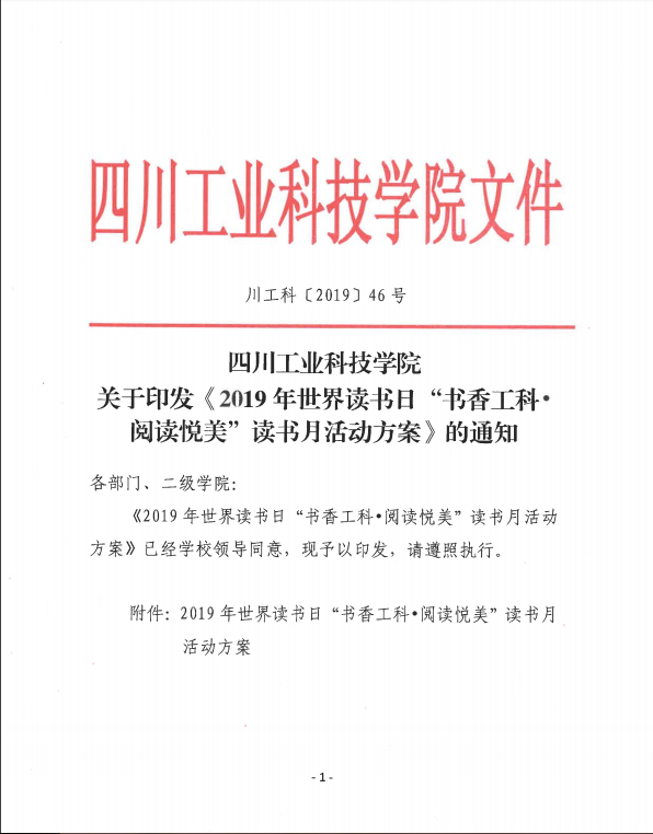 四川工业科技学院关于印发《2019年世界读书日“书香工科?阅读悦美”读书月活动方案》的通知
