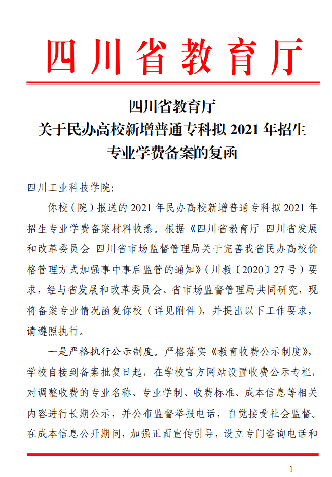 四川省教育厅关于民办高校新增普通专科拟2021年招生专业学费备案的复函