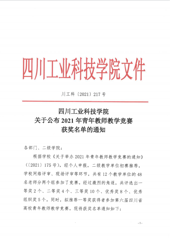 四川工业科技学院关于公布2021年青年教师教学竞赛获奖名单的通知
