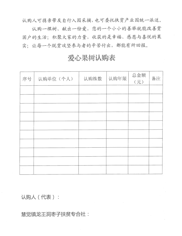 慧觉镇龙王洞枣子扶贫专合社爱心扶贫枣树认购表