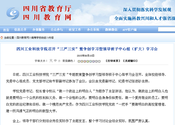日前,四川工业科技学院“三严三实”专题教育暨争创学习型领导班子中心组学习会召开。全体校级领导、党委中心组成员、党支部书记和专职副书记参加了会议。会议由党委副书记、纪委书记张进砂主持。