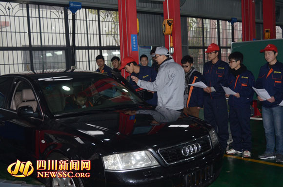 目前,四川工业科技学院正抓紧与德国柏林职业教育集团联手打造中德汽车学院。在四川工业科技学院2000多平米的中德汽车学院实训中心里,各型设备有序运行,赴德国培训回来的教师袁新正在为汽车检测与维修技术专业大二学生们指导修理汽车,完成作业。“这里既是教室,也是修理厂。这些正在维修中的车辆都是真实需要维修的社会车辆,并非模拟教具,学生正是在实战中才能得到培养锻炼,成长为应用型人才。”