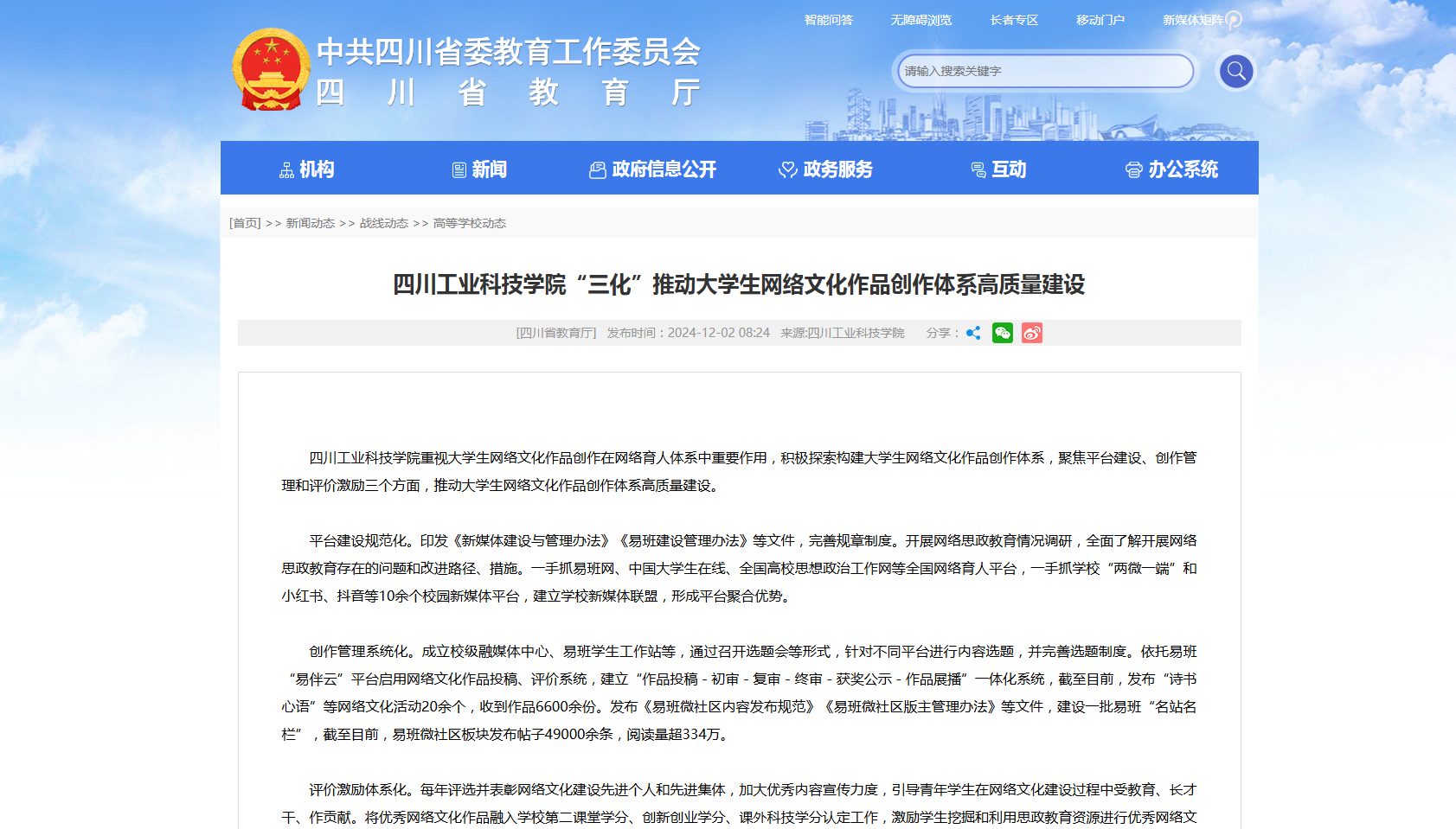 四川工业科技学院重视大学生网络文化作品创作在网络育人体系中重要作用,积极探索构建大学生网络文化作品创作体系,聚焦平台建设、创作管理和评价激励三个方面,推动大学生网络文化作品创作体系高质量建设。