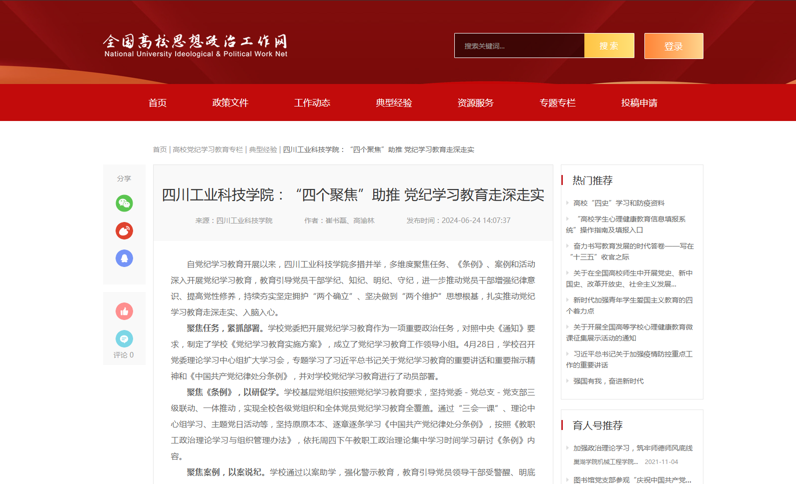 自党纪学习教育开展以来,四川工业科技学院多措并举,多维度聚焦任务、《条例》、案例和活动深入开展党纪学习教育,教育引导党员干部学纪、知纪、明纪、守纪,进一步推动党员干部增强纪律意识、提高党性修养,持续夯实坚定拥护“两个确立”、坚决做到“两个维护”思想根基,扎实推动党纪学习教育走深走实、入脑入心。