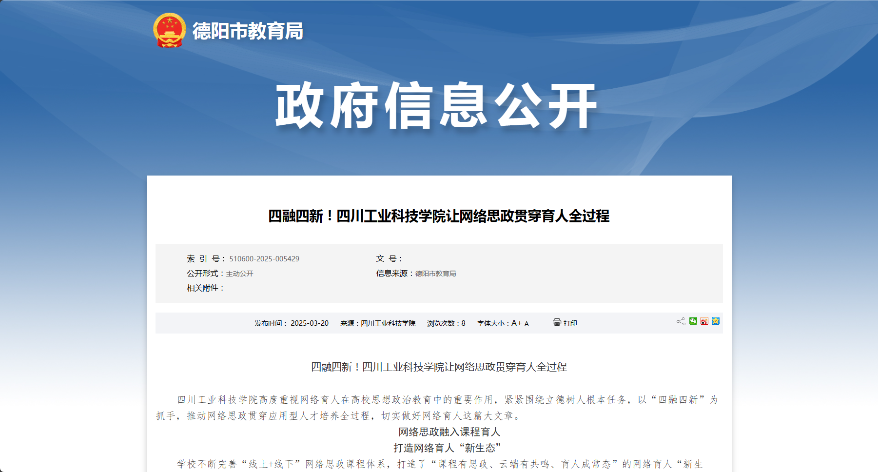 四川工业科技学院高度重视网络育人在高校思想政治教育中的重要作用,紧紧围绕立德树人根本任务,以“四融四新”为抓手,推动网络思政贯穿应用型人才培养全过程,切实做好网络育人这篇大文章。