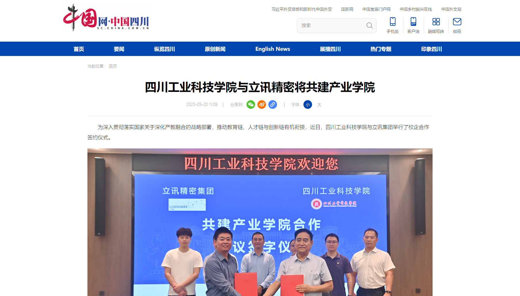 为深入贯彻落实国家关于深化产教融合的战略部署,推动教育链、人才链与创新链有机衔接,近日,四川工业科技学院与立讯集团举行了校企合作签约仪式。