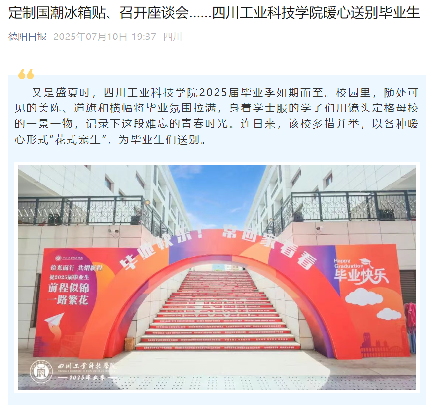 又是盛夏时,四川工业科技学院2025届毕业季如期而至。校园里,随处可见的美陈、道旗和横幅将毕业氛围拉满,身着学士服的学子们用镜头定格母校的一景一物,记录下这段难忘的青春时光。连日来,该校多措并举,以各种暖心形式“花式宠生”,为毕业生们送别。