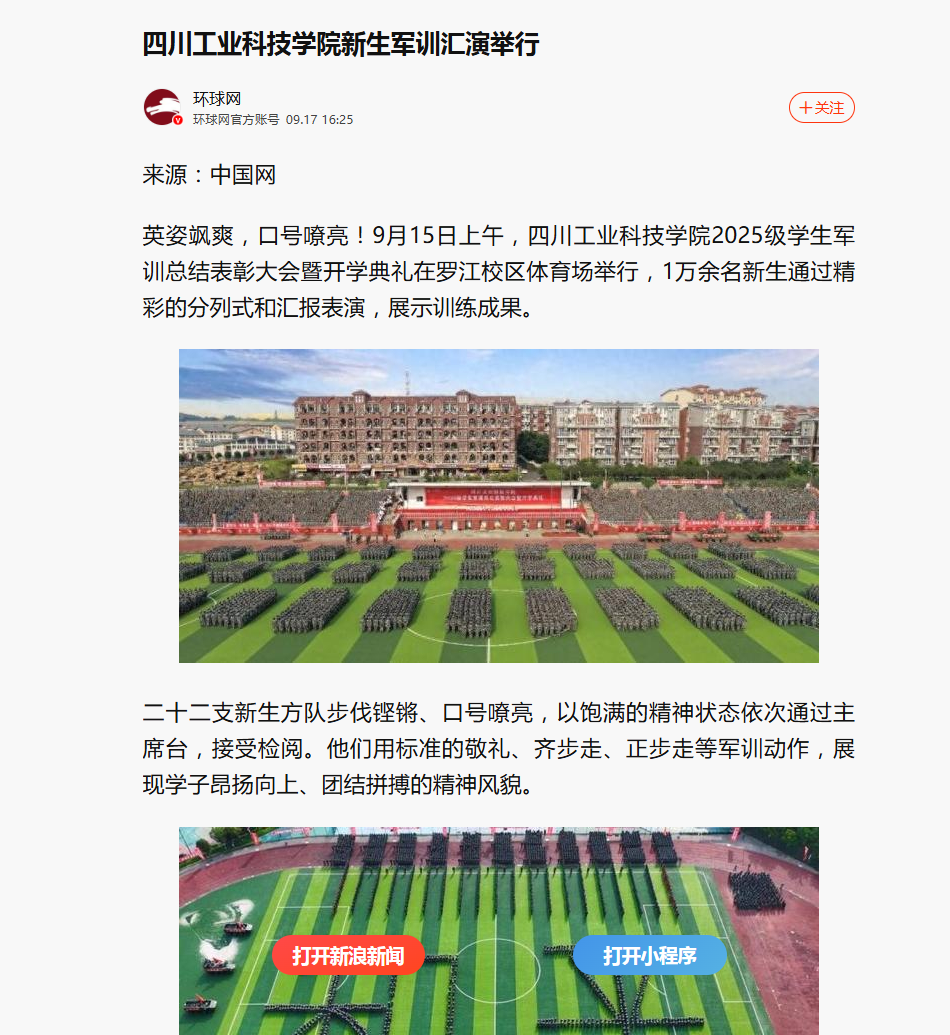 英姿飒爽,口号嘹亮!9月15日上午,四川工业科技学院2025级学生军训总结表彰大会暨开学典礼在罗江校区体育场举行,1万余名新生通过精彩的分列式和汇报表演,展示训练成果。