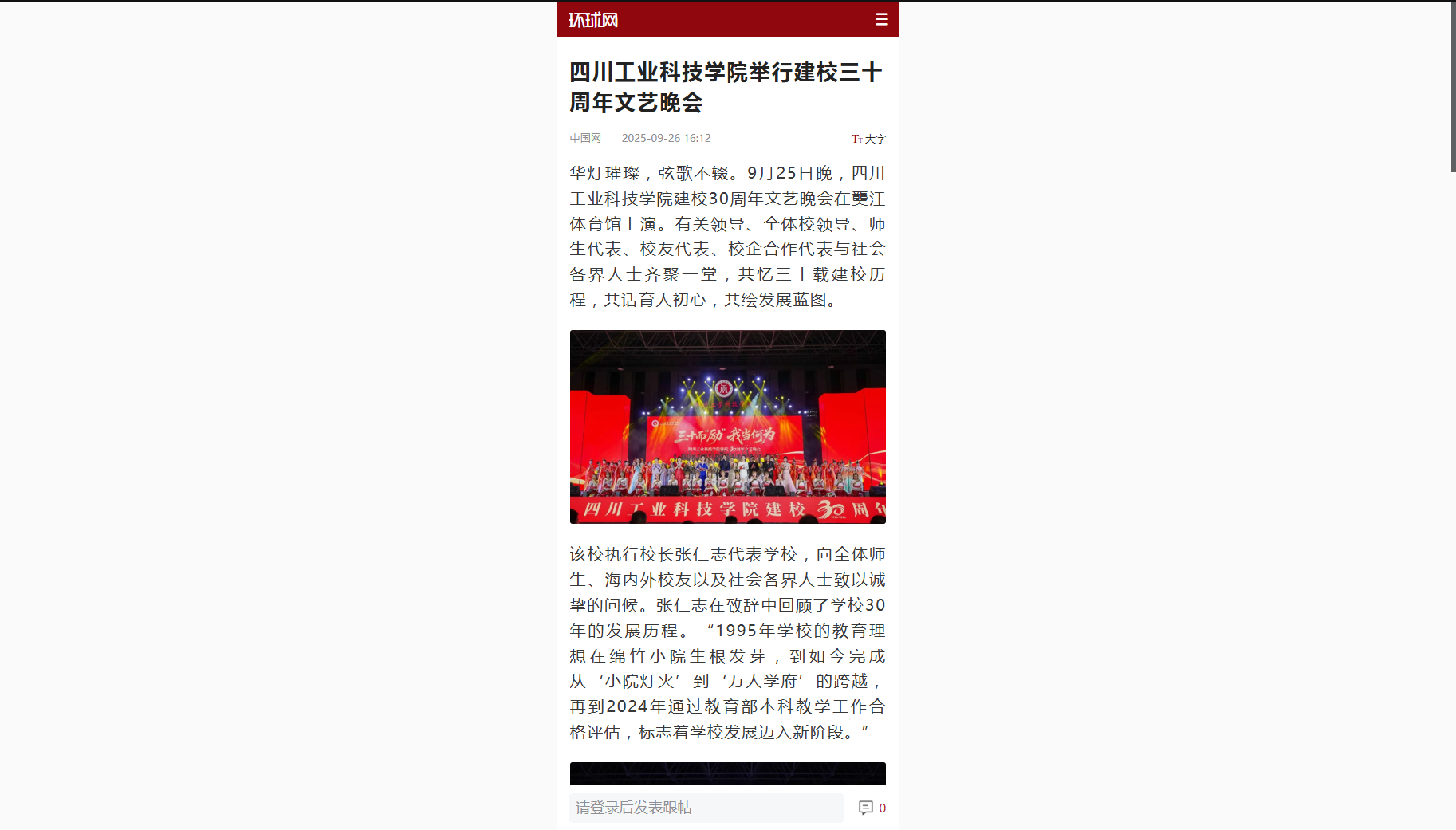 【环球网】四川工业科技学院举行建校三十周年文艺晚会