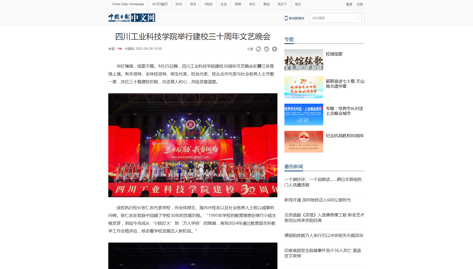 【中国日报网】四川工业科技学院举行建校三十周年文艺晚会