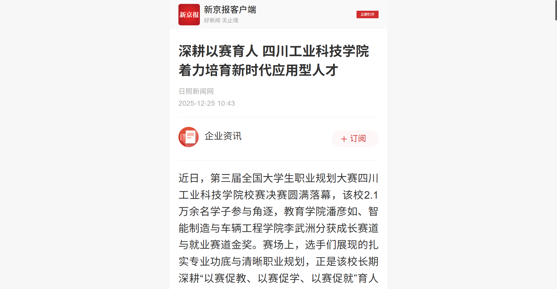 “面对当前就业形势,学校坚持以赛促教、以赛促学、以赛促就,将大赛作为推动生涯教育、提升就业质量的重要载体。”四川工业科技学院相关负责人表示,下一步,学校将继续以赛事为桥梁,深化理论与实践的融合、推动知识与技能的衔接,在深耕赛事育人的道路上持续探索创新,为培养更多具备创新精神、实践能力和社会责任感的新时代应用型人才筑牢根基,让青年学子在实践奋斗中绽放青春梦想。
