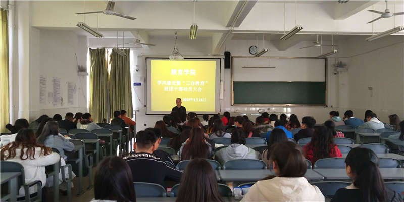 近日,为促进学院学风班风建设,教育学院在毓秀楼101教室召开学风建设暨“三自教育”班团干部动员大会,党支部书记熊定永、团总支书记黄译漫及教育学院学生分会和各班主要干部代表参加会议。